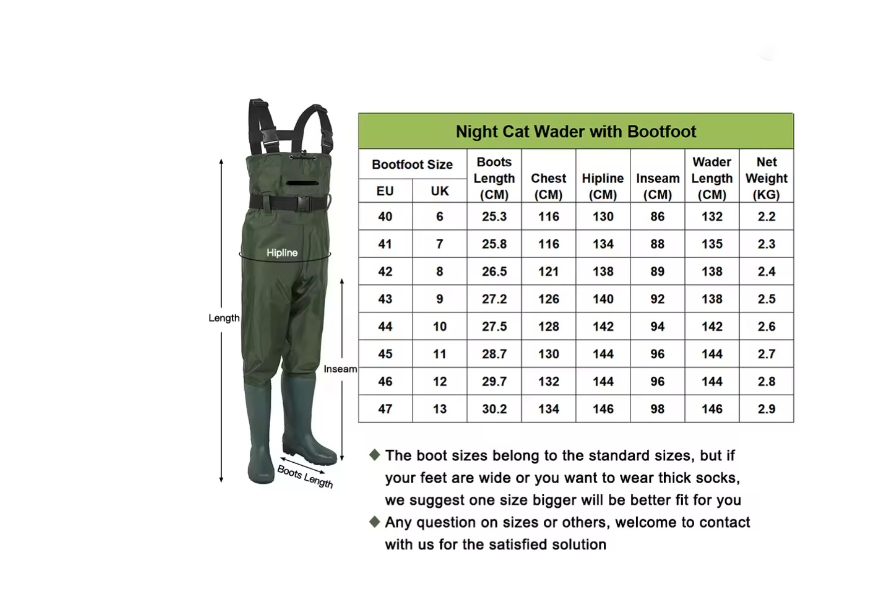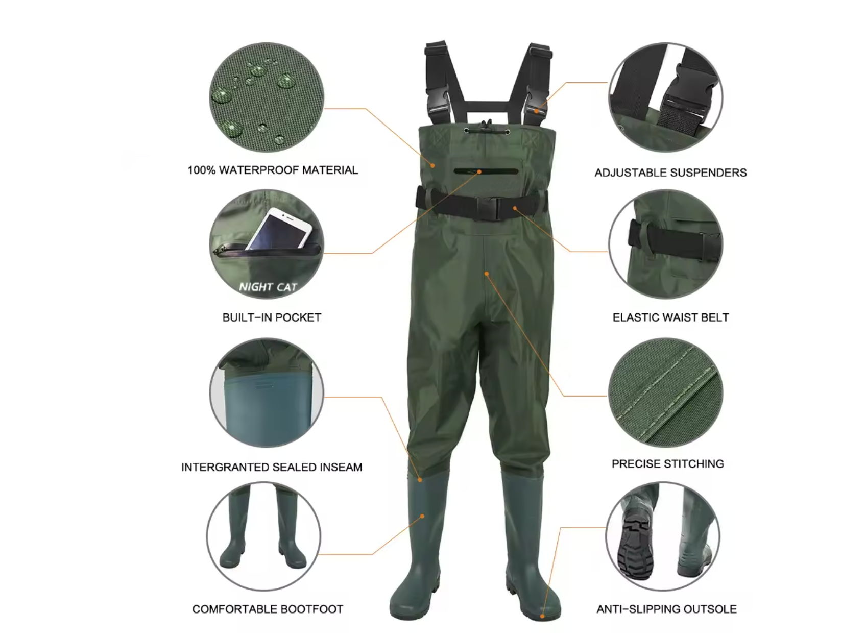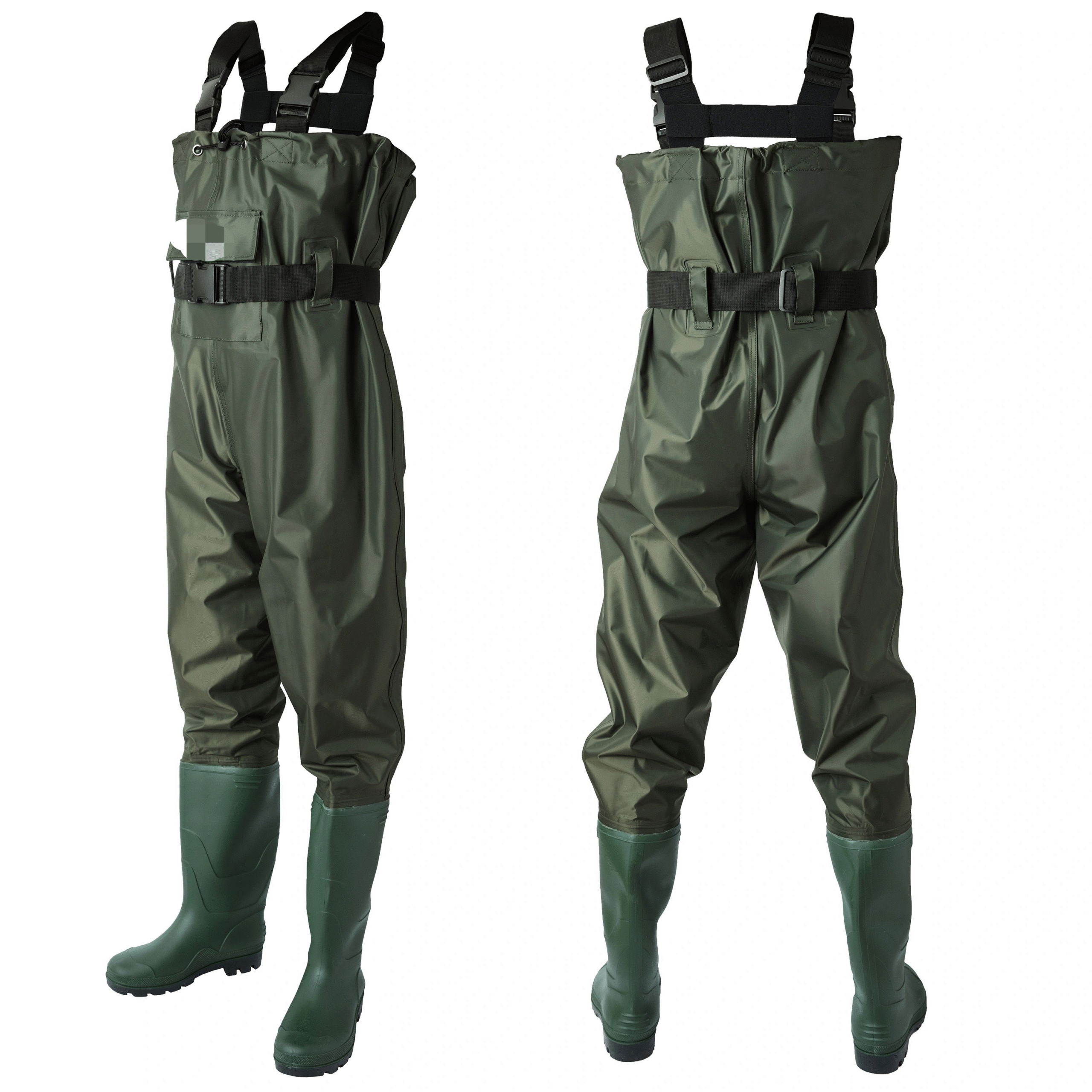 70D Nylon fabric waders ,outer chest pocket, Waist belt, Drawstring Adjustable elastic suspenders, High quality anti-slip PVC boots Double needle stitching, Hermetic waterproof tape inside on all seam Any logos are available according to customer’s requirement The both nylon fabric and PVC boots passed the TüV PAHs testing.Strictly waterproof test for 100% of production Size: EU 38 to 46, UK 4 to 12