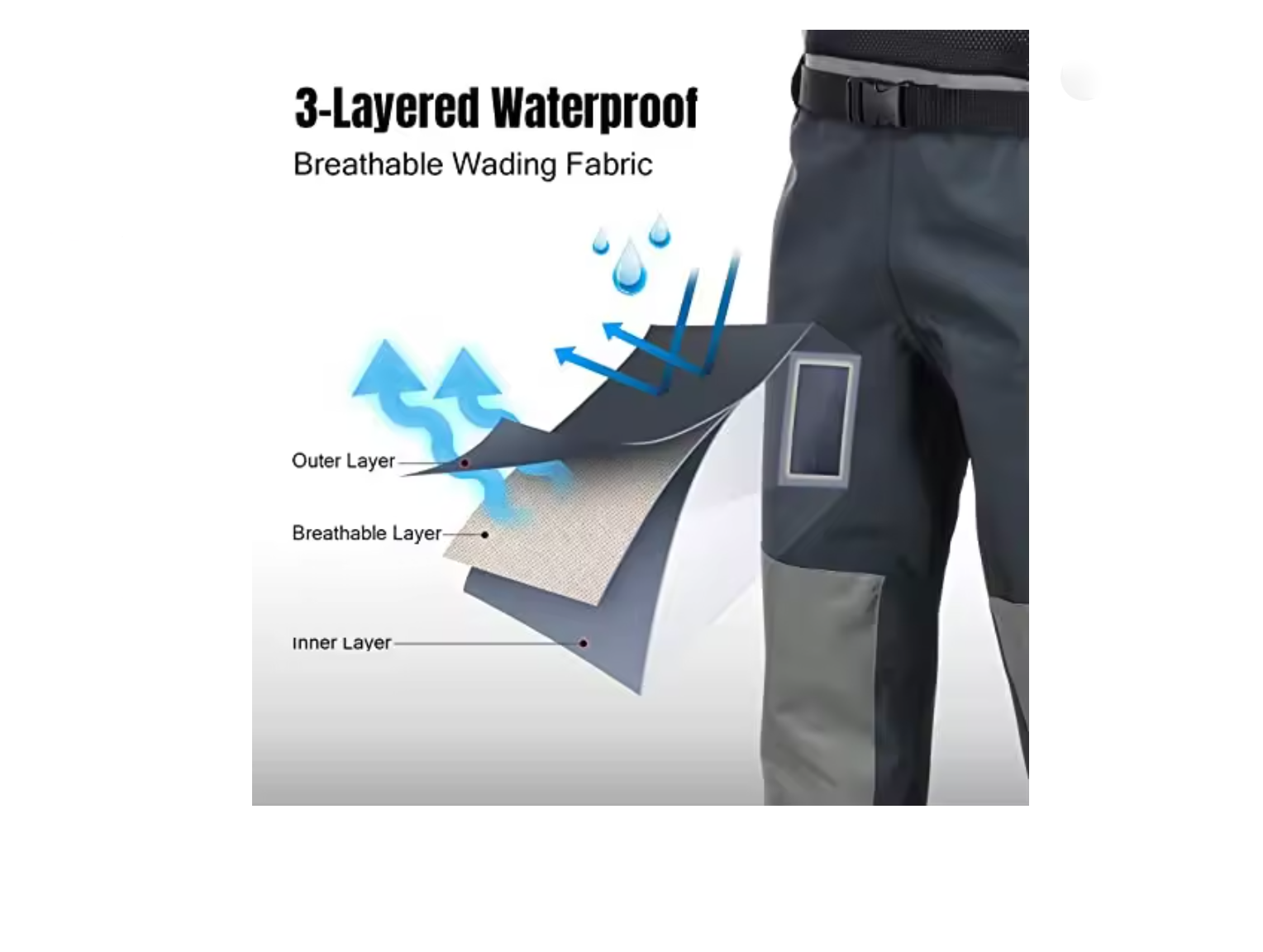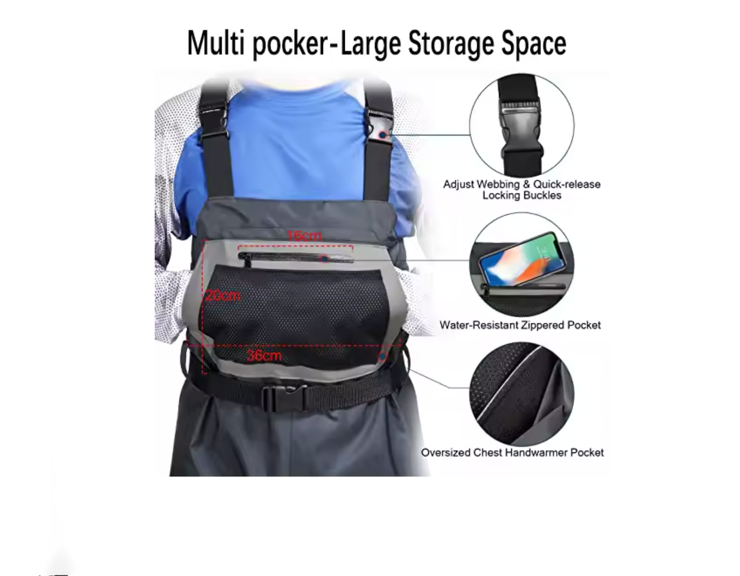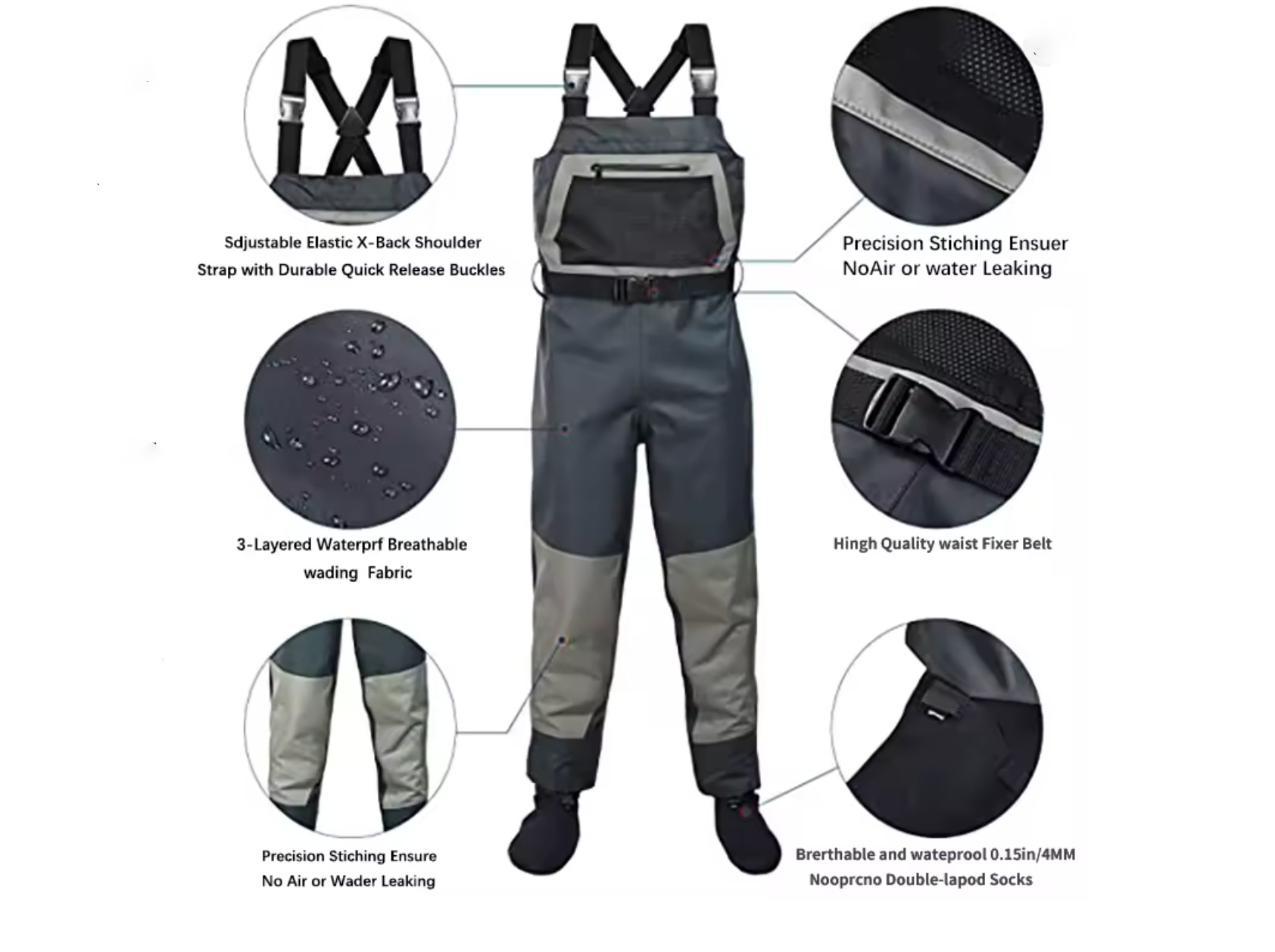 outer chest pocket, Waist belt, Drawstring Adjustable elastic suspenders, 3-layer. High quality anti-slip, with neoprence socks,Double needle stitching, Hermetic waterproof tape inside on all seam Any logos are available according to customer’s requirement .The both nylon fabric and with neoprence socks passed the TüV PAHs testing.Strictly waterproof test for 100% of production